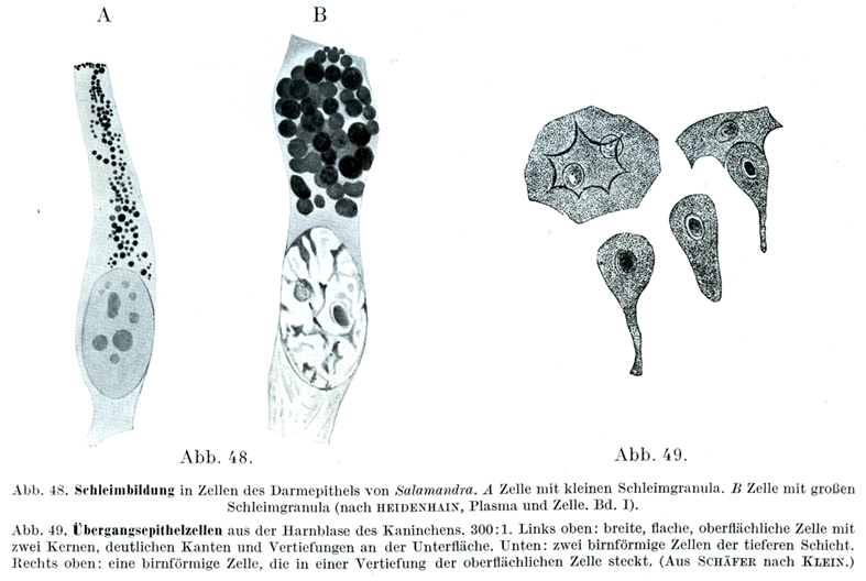 [図48]サンショウウォの腸上皮細胞における粘液形成.Aは小さい粘液顆粒をもつ細胞.Bは大きい粘液顆粒をもつ細胞.(Heidenhain, Plasma und Zelle. Bd. Iによる.)