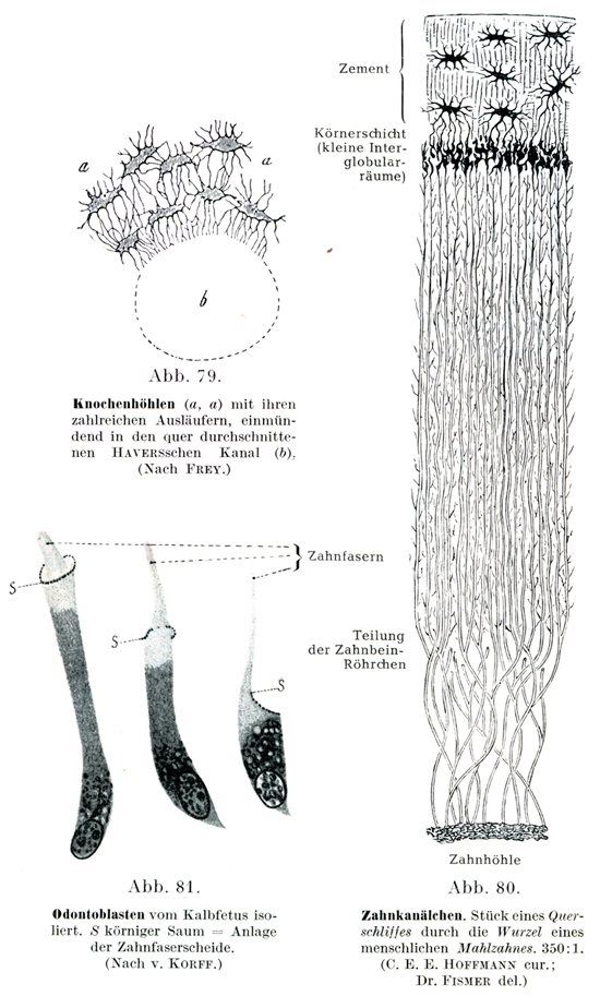 歯線維およびその枝はいずれもゾウゲ質を貫くゾウゲ細管Zahnkanalchen oder Dentinröhrcheという細かい管のなかにある.この細管の壁は他の基質に比べて,いっそうつよく光を屈折し,またいっそう固い.そこを歯線維鞘Zahnfaserscheide (Neumann)という.
