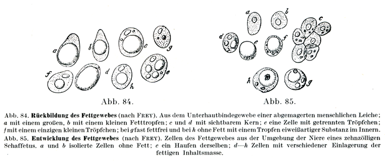 新鮮標本を染めないままでみると脂肪細胞の核と原形質はこれらが光学的断層optischer Durchschnittにあるときに限って,はっきりと観察される.その他の一では脂肪滴の輝きがつよくて核の像は全く消されてしまう.脂肪がまだ細胞を完全に充たしていないとき,あるいは消費されて脂肪が減ったときは,その細胞像がいっそうよく理解できる.そういう細胞では核と原形質がはなはだたやすく認められるのである.脂肪の含有が少ないときは脂肪球が1個でなくて,それが2個以上に分かれていることがある(図84,85).