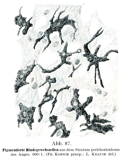 1)色素上皮細胞pigmentierte Epithelzellen, 色素結合組織細胞pigmentierte Bindegewebzellen, 色素神経細胞pigmentiete Nervenzellen, 色素筋細胞と色素筋線維 pigmentierte Muskelzellen und-fasernがある.色素は常に組織細胞Gewebezellenの内部にある.色素上皮細胞は有色人種の皮膚に広い範囲にわたって存在する.白色人種では陰茎,陰嚢,肛門付近,腋窩,眼瞼の皮膚や眼の結膜にそれがある.色素は主として表皮の下部の細胞層にある.色素結合組織細胞は体じゅうどこにも存在し得るが,最もその数の多いのが眼球中膜Tunica media oculi(すなわち脈絡膜と毛様体と虹彩)であり,それについで多いのはすぐ上に述べた皮膚の一部で色素に富む場所である.動物では色素顆粒をもつ軟骨細胞pigmentierte Knorpelzellenも存在する.まだ瞳孔散大筋M. dilatator pupillaeは色素筋細胞よりできている.色素神経細胞は中枢神経系の特別の場所にある(黒核Nucleus niger,青斑Locus caeruleus).比較的年配の人の神経細胞には正常の現象と色素が存在する.(原著註)