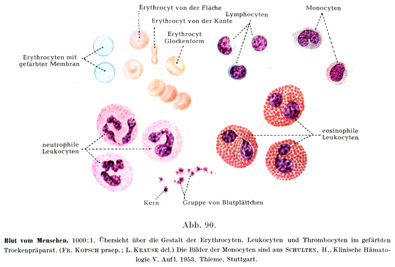 [図90]ヒトの血液 ×1000. 乾燥標本を染めて赤血球,白血球,血小板の形状を外観を示す.単核球の図はSchulten, H., Klinische Hämatologie. V. Aufl.1953. Thieme, Stuttgartより借用した.