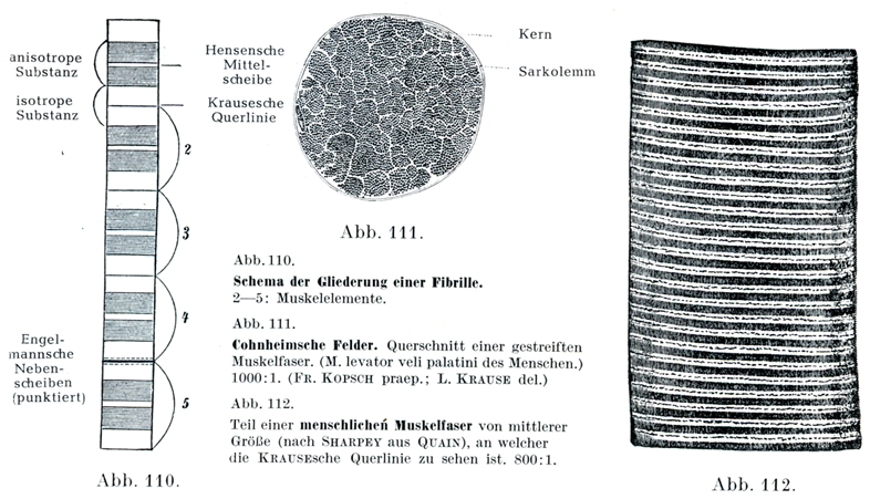 [図112]中くらいの太さの横紋筋線維(人)の一部(Sharpeyによる,Quainの本からの引用).間膜Krausesche querlinieがみえる.×800.