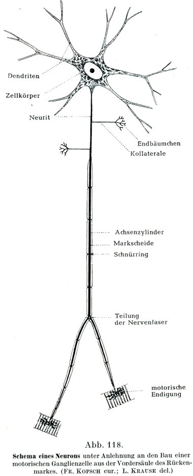 この突起は中枢器官の中をとおる間に細い側枝Kollateralenを多くは直角をなしえ出し,側枝はまもなくごく細い枝でできた叢すなわち終末分枝Endbäumchen, Telodendronをもって終わる.軸索突起もまた1度あるいはそれ以上の回数,2つの同価置の枝に叉状dichotomischに分かれることがある.それは図118の運動性ニューロンの模型図に示されている.