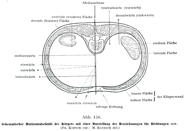 頭方kranial,近位proximalの位置と方向という表現はその逆であるところの尾方kaudal,遠位distalの位置と方向とくらべると自ら明らかとなる.背方dorsalの位置と方向は腹方ventralと逆だから,これもすぐわかる.近位および遠位という表現は上肢と下肢の場所について用いられて,それが体幹に近いか遠いかを意味するのである.また橈側radialis,尺側ulnaris,脛側tibialis,腓側fibularisという表現は体肢においてそれぞれの骨との局所的な関係が示されるのである.これらの語によって,体肢が全身に対していかなる位置をとっていても,それとは無関係に方向をいうことができる.体肢の伸側は背側dorsalとよばれ,上腕と前腕と手の屈側は掌側volarといい,足の屈側は底側plantarの面とよばれる.大腿の屈側は腹側面ventrale Flächeといわれるが,下腿は前面と後面vordere und hintere Flächeをもっている.視覚器と聴覚器では位置を云いあらわすのにいくつかの特別な名称が必要であり,じっさい慣用されている.左links, 右rechtsという表現は少しも混同される心配がない,内方innen,外方außenという表現は空所についての位置の関係にのみ用いられる.また浅superficialis,深profundusという表現は全身の表面,あるいは1つの器官の表面に近いか遠いかをいうのに用いるのである.図156は上に述べたことがらを示している.