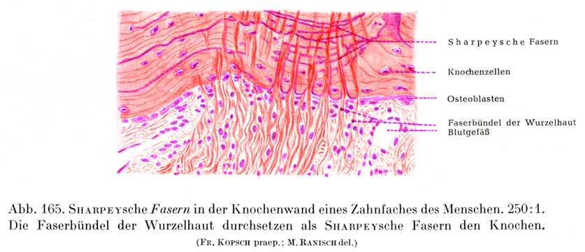 [図165]ヒトの歯槽の骨壁におけるシャーピー線維 ×250 歯根膜の線維束はシャピー線維となって骨に侵入する.