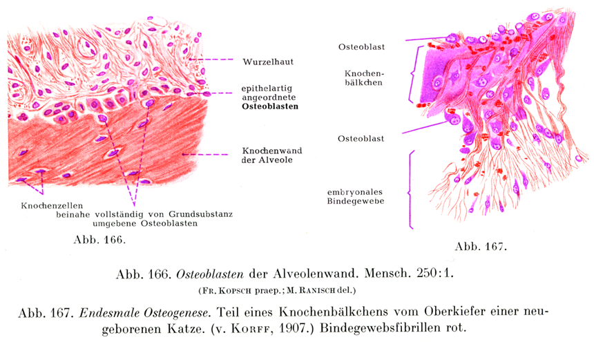 [図167]結合組織内骨発生 ネコの新生児の上顎の骨小梁の一部(v. Korff,1907).結合組織原線維は赤.
