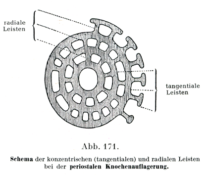 放射状突起のつづきとしても,あるいはまた切線状突起の中央すなわち2つの切線状突起の合するところからも,更にあらたに放射状突起が出て,その端がすぐまた同心性の突起の形をとって隣りのものと向かい合っているものもある.それで第1次,第2次,第3次などの放射状および同心性突起を区別できることになる.ついに新しい放射状突起の形成が止むと,骨質はなおしばらく同心性に積み重ねられ,こうして骨を包む層板すなわち外基礎層板が形成される.緻密質の構築をたやすく理解できるように模型的に述べれば,以上のような現象が起こるわけである.しかし基礎層板がそんなに速やかにつくられるとはかぎらないことも直ちにわかることで,基礎層板の形成が場所によっては全く行なわれないことすらある.また骨の吸収現象が基礎層板の厚さの成長と相殺しあうこともある.しかしそのばあいにもなお厚さの成長の原則はまもまれているのである.外力に耐える,細かい構造をもった,力強い骨梁は,この様にして驚くべき単純さで出来上がるのである.まだ広いハヴァース管は,骨質があらたに同心性に積み重なることによって,次第に狭められる.