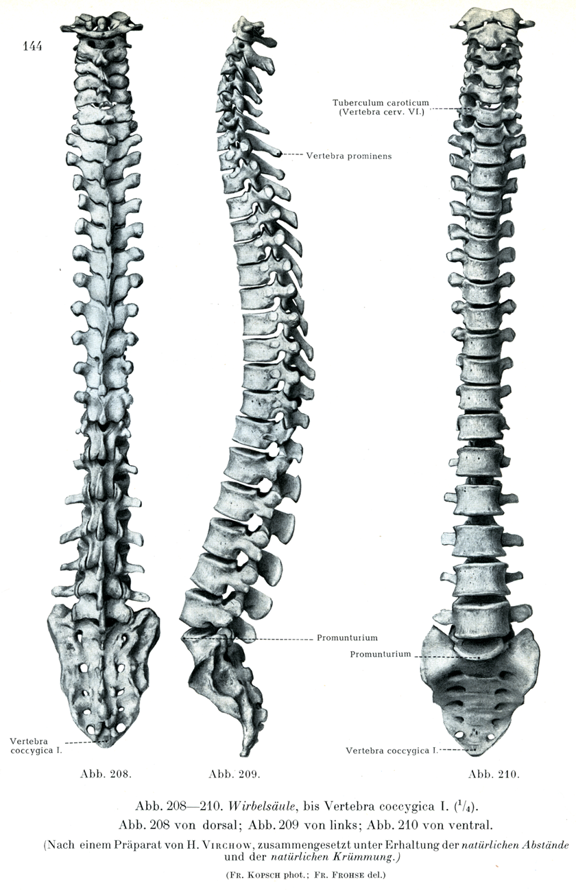 [図208~210]脊柱 第1尾椎まで(1/4) 図208は後方から,図209は左方から,図210は前方からみたところ.(自然の間隔と自然の弯曲とを保って組み立てたH. Virchowの標本)