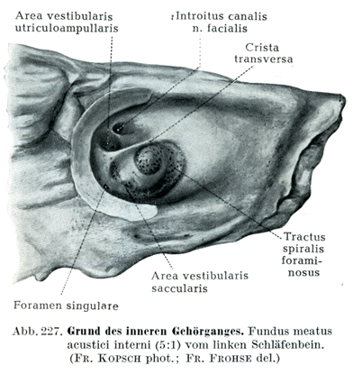 内耳孔の外側には錐体稜の近くに弓状下裂孔Hiatus subarcuatusがあり,そこは新生児では弓状下窩Fossa subarcuataというくぼみになっている(図225).さらに下方,内耳道から外側へほぼ水平方向に8mmへだたったところに,重要な裂隙状の前庭小管内口Apertura interna canalilculi vestibuliがあって,下外側方へ向かって開いている.