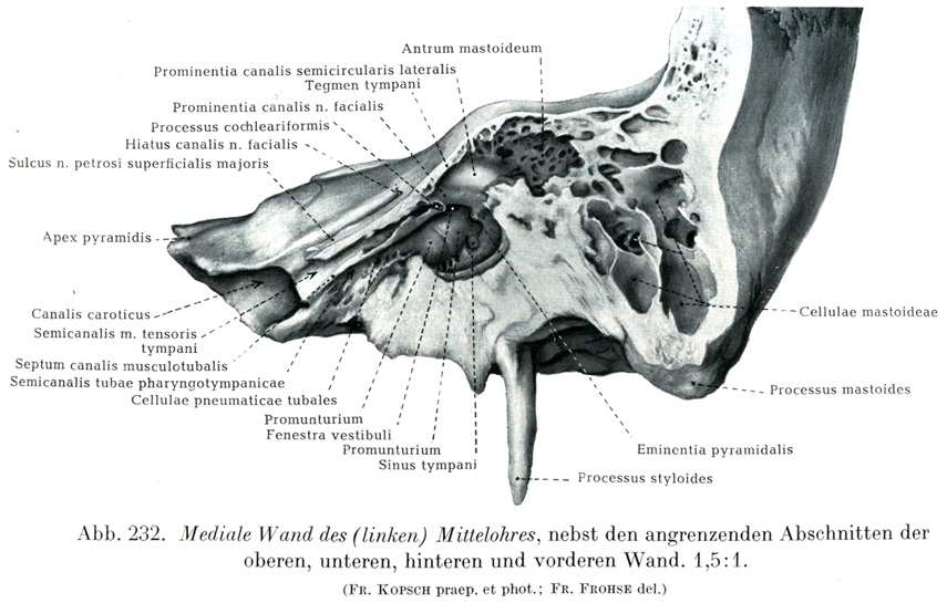 [図232]中耳(左)の内側壁とこれに続く上・下・後壁の部分 ×1.5