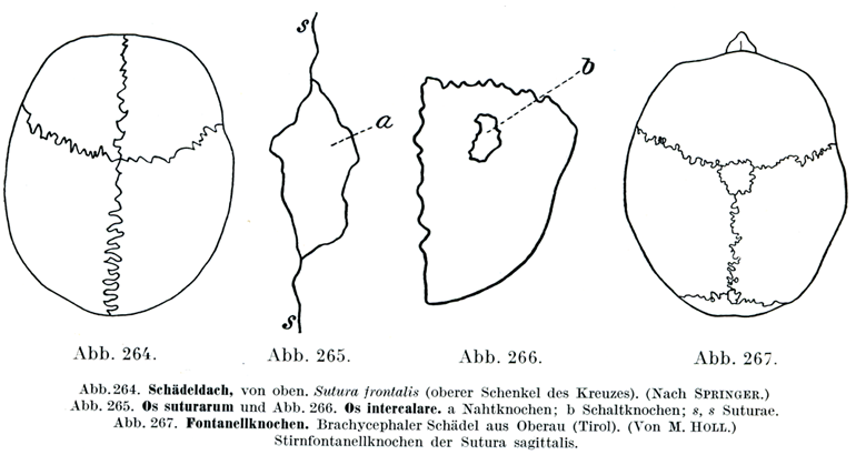 1. 本来の縫合骨Ossa suturarum, eigentliche Nahtknochen.その存在がとくに異常とはいえない縫合によって,島のようにとり囲まれて生じる大小さまざまの骨である(図265).