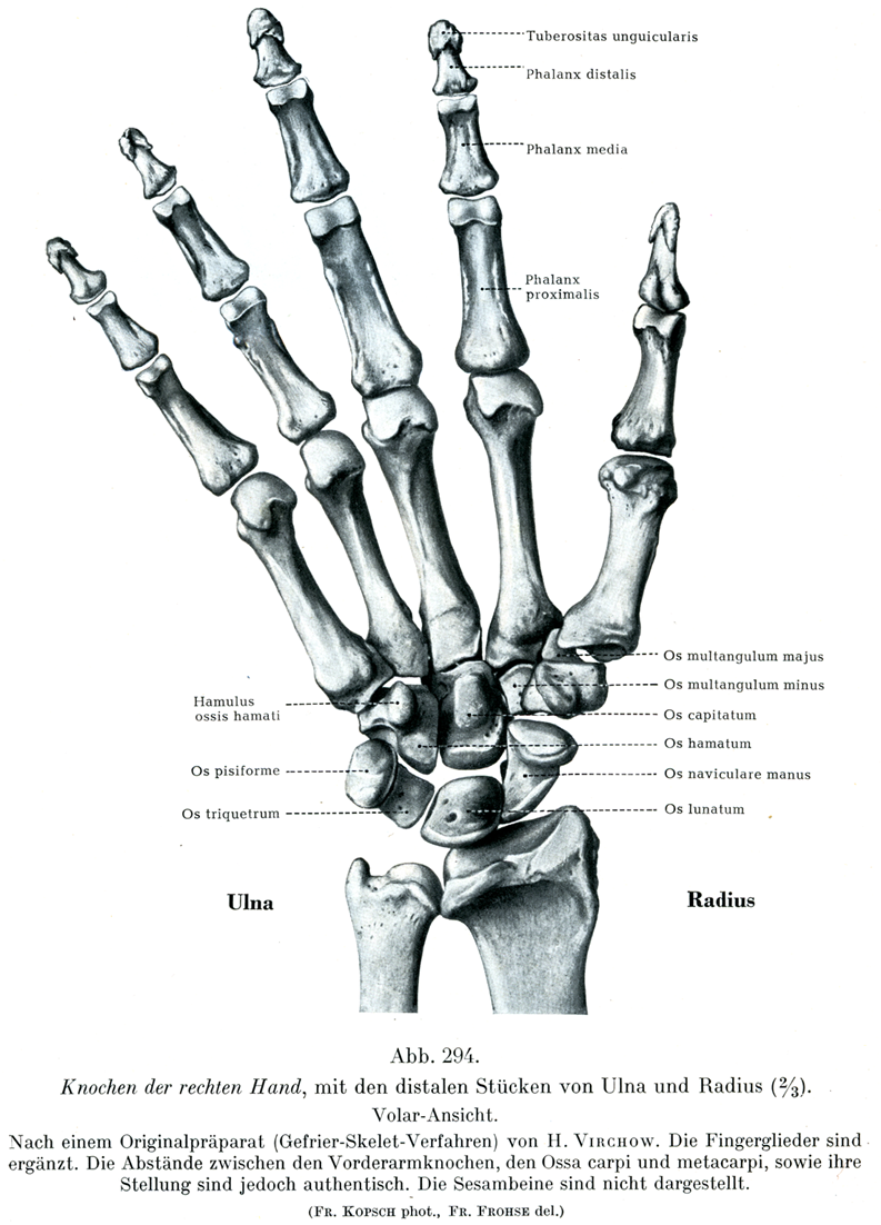 [図294]右の手の骨 尺骨および橈骨の下端をふくむ.手背面(2/3) H. Virchow原作の(凍結骨格処理法による)標本.は修復されているが,前腕骨・手根骨・中手骨の間隔と向きは信頼すべきものである.種子骨は示してない.