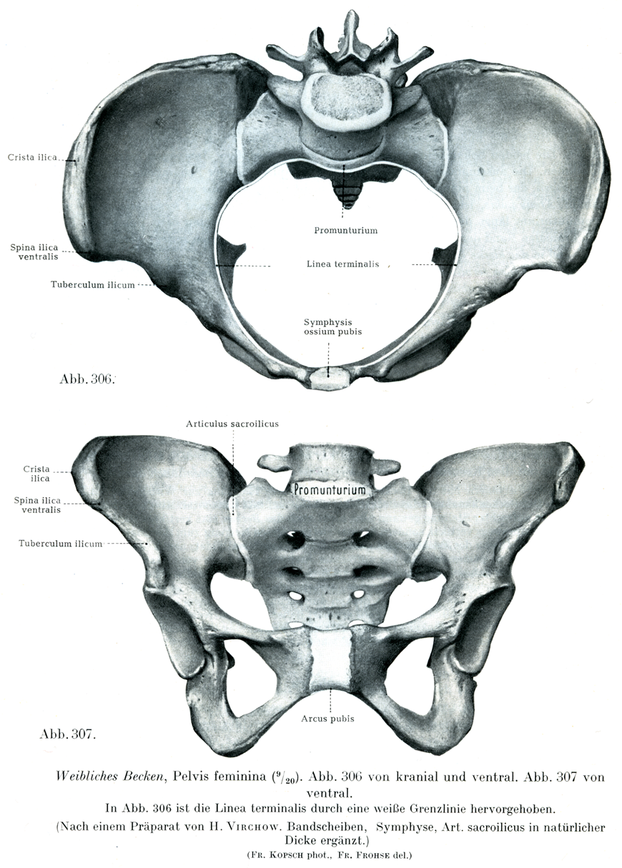 [図306,307]女の骨盤(9/20),図306は前上方から,図307は前方からみる.図306では分界線が白い境界線であらわしてある.