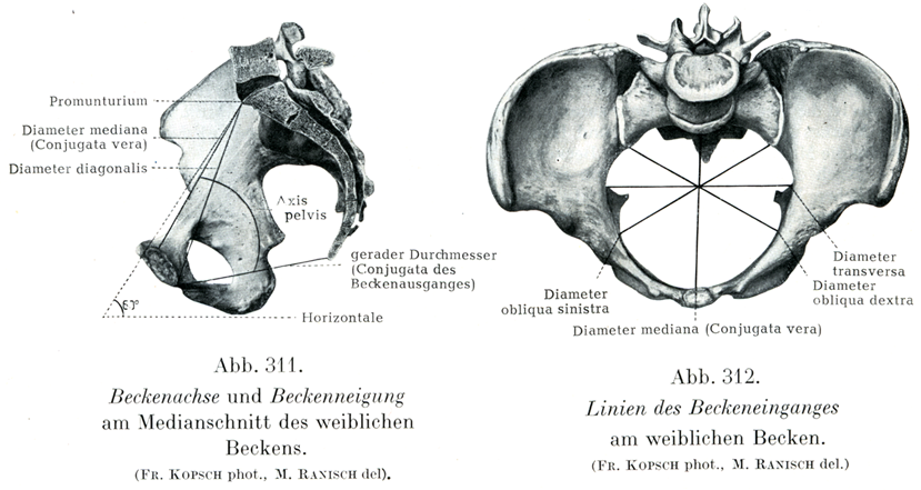 1. 骨盤出口の縦径または結合線gerader Durchmesser od. Conjugata des Beckenausganges(9.5~11.5cm)(日本人女性で11.1cm(小金井・大沢),10.6cm(工藤)である.)は尾骨の先端から恥骨弓の頂点にいたる.