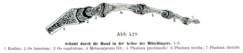 [図429] 中指の軸を通る手の断面(1/3) 1. 橈骨,2. 月状骨,3. 有頭骨,4. 第3中手骨,5. 基節骨,6. 中節骨,7. 末節骨.