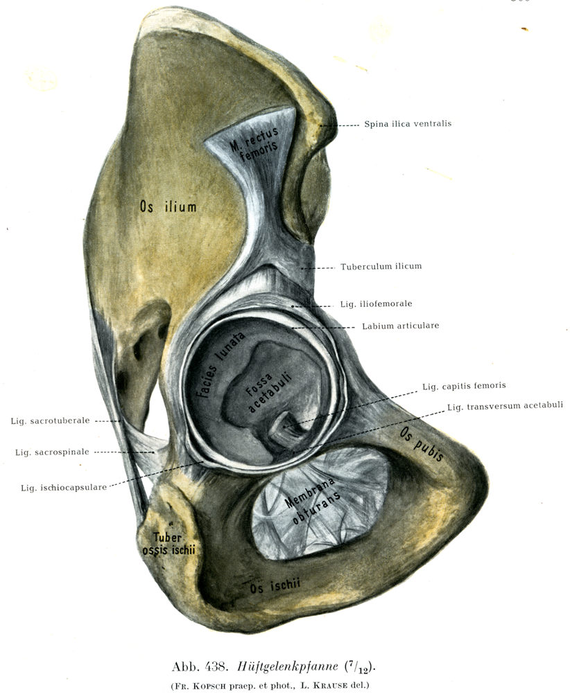 大腿骨頭の関節面は球面のほぼ2/3を占める.曲率半径は男で2.6cm,女で2.4cmである(Fick).従って関節頭の弯曲は正確に関節窩の弯曲に一致しているわけである.(球形からそれている場合がある.)軟骨の厚さは関節頭の中央から縁へかけて次第に減じる(これについてはWernerの詳細な報告がある).大腿骨頭窩は軟骨の上縁より下縁に近くあって,大腿骨頭靱帯がここに付いている(図441).