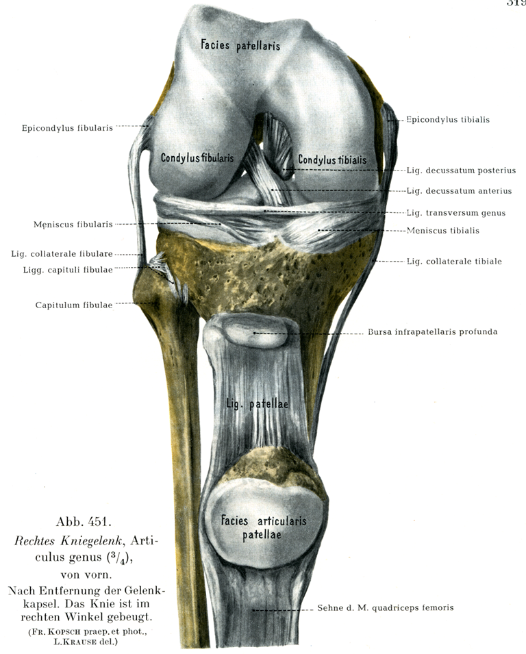 この靱帯は斜めに前下内側へ走り腓側半月の前端の近くにつき,そのさいこの靱帯の1部の線維束が半月の中に侵入している(図451).