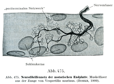 [図475] 運動終板の神経原線維の網 コウモリVespertilio murinusの舌の筋線維 (Boeke,1909).