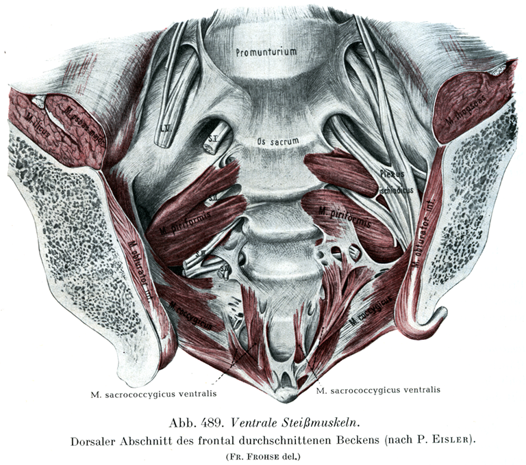 [図489] 腹側の尾骨筋群 骨盤を前額断してその背方部を前よりみる(P. Eislerによる).
