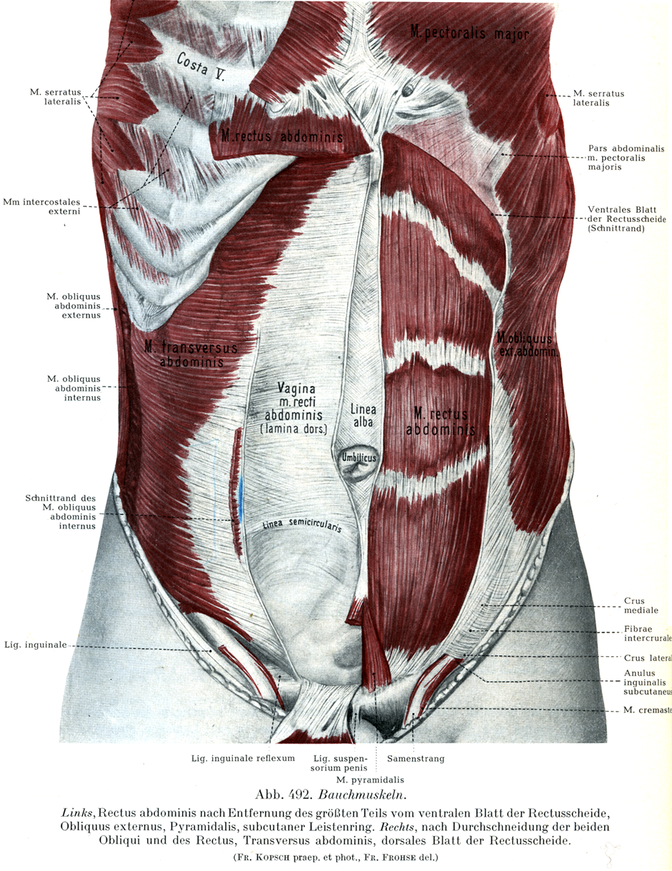 [図492] 腹筋.左:腹直筋,その鞘の前葉の大部分を取り除いてある,外腹斜筋,錐体筋,浅鼡径輪.右:内,外両腹斜筋と腹直筋とを切断し,腹横筋と腹直筋鞘の後葉を示す.