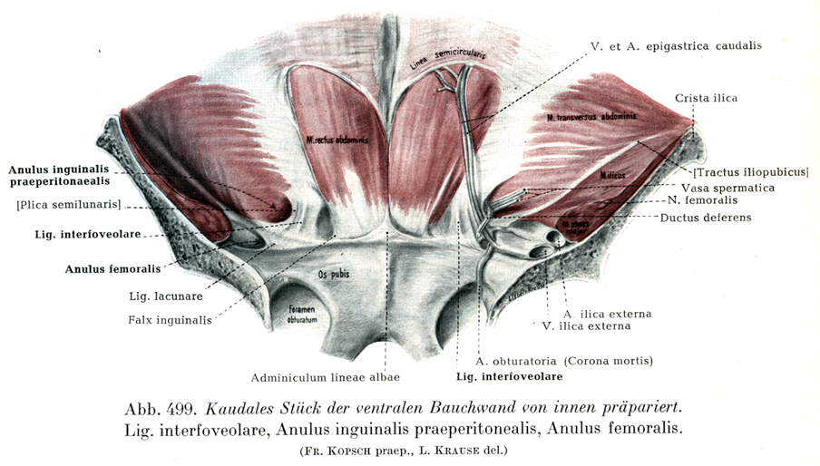後天性の鼡径ヘルニアは鼡径管を通って壁側腹膜が外におし出されたときであり,先天性の鼡径ヘルニア(あるいはその素因)は腹膜鞘状突起が開存しているところを腹部の内臓が通って腹腔の外に出るときである.この両方のばあいに下腹壁動静脈はヘルニア嚢Bruchsackの頚の内側にある.しかし内鼠側径ヘルニアHernia inguinalis medialisのときには全く違っている.このときには腹膜下鼡径輪はヘルニアの入口とならずに,鼡径鎌と窩間靱帯とのあいだにある内側鼡径窩の弱い部分が前方にとび出すのである.このヘルニアに浅鼡径輪のところに現われるのであるが,ここでは下腹壁動静脈はその外側にある.それゆえ何かの手術を加える必要があるようなときには,この血管との位置関係が顧慮されなければならない.このヘルニアは一名直接direkt鼡径ヘルニアと呼ばれ,外側鼡径ヘルニアは斜schräg(間接indirekt)鼡径ヘルニアあるいは鼡径管ヘルニアKanalhernieと呼ばれる.