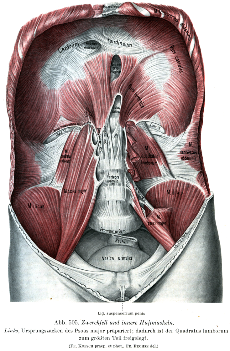 左:大腰筋の起始尖頭を解剖してある,かくして腰方形筋の大部分がよくわかるようにしてある.