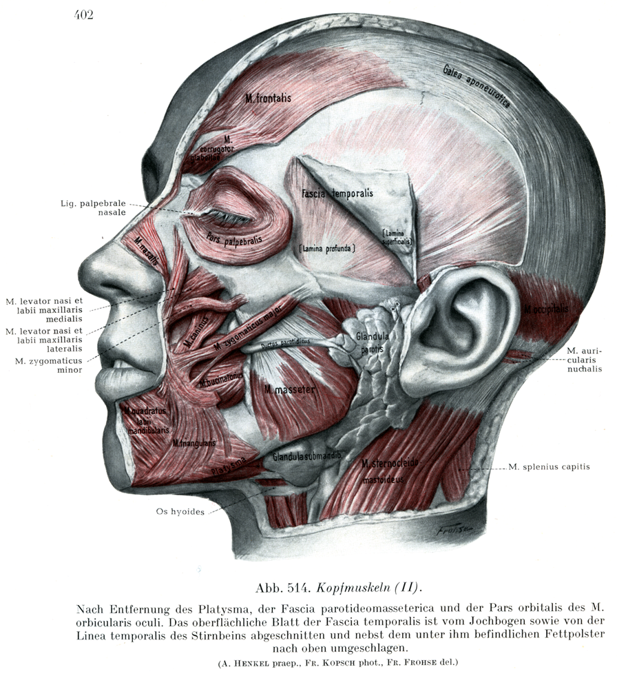 [図514] 頭部の筋(II) 広頚筋耳下腺咬筋膜および眼輪筋の眼窩部を取り除いてある.側頭筋膜の浅葉は,頬骨弓ならびに前頭骨の側頭線から切り離し,その下にある脂肪層とともに上方に折り返してある.