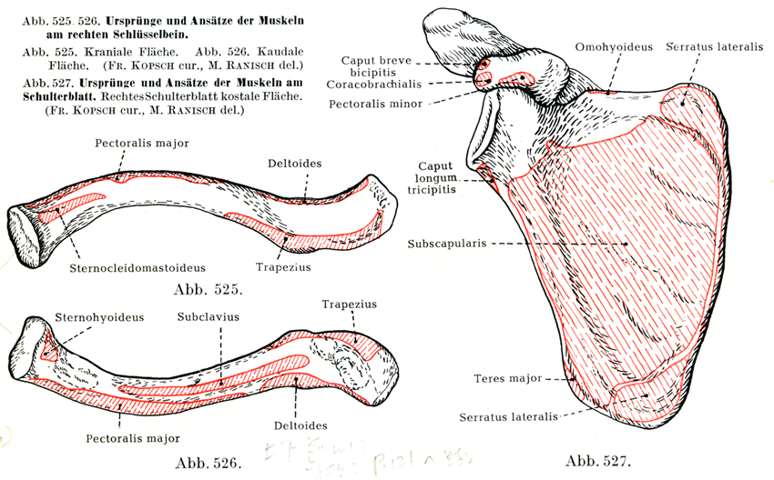 [図525, 526] 右鎖骨における筋の起始と停止 図525. 上面. 図526. 下面.