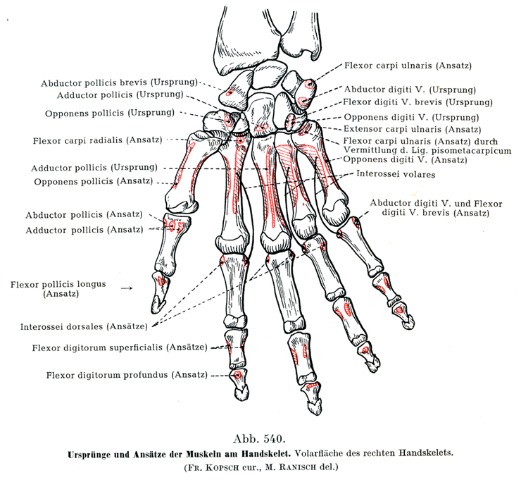 [図540] 手骨における筋の起始と停止 右の手骨の掌側面.
