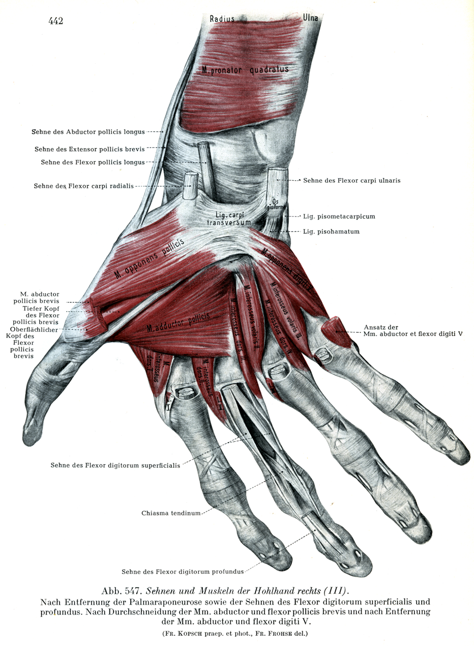 手掌腱膜と浅深の両指屈筋の腱とを取り除いてある.短母指外転筋と短母指屈筋とを切断し,小指外転筋と小指屈筋とを取り除いてある.