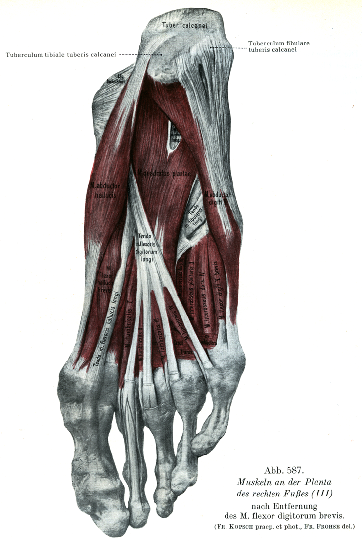 この筋は踵骨隆起の脛側結節の下面から起り,足底腱膜に被われて前方にのび(図583)4つの腱に分れる.この腱は長指屈筋の腱と合して前進し,共通の腱鞘である指腱滑液鞘Vaginae synoviales tendinum digitorum pedisに包まれている.これらの腱は第2~第5指の中節骨の底に停止するのである.
