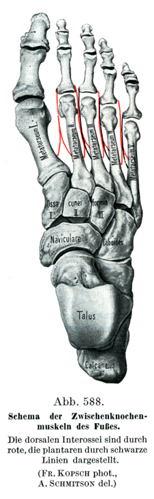 [図588] 足の骨間筋の模型図 背側骨間筋は赤い線,底側骨間筋は黒い線で示す.