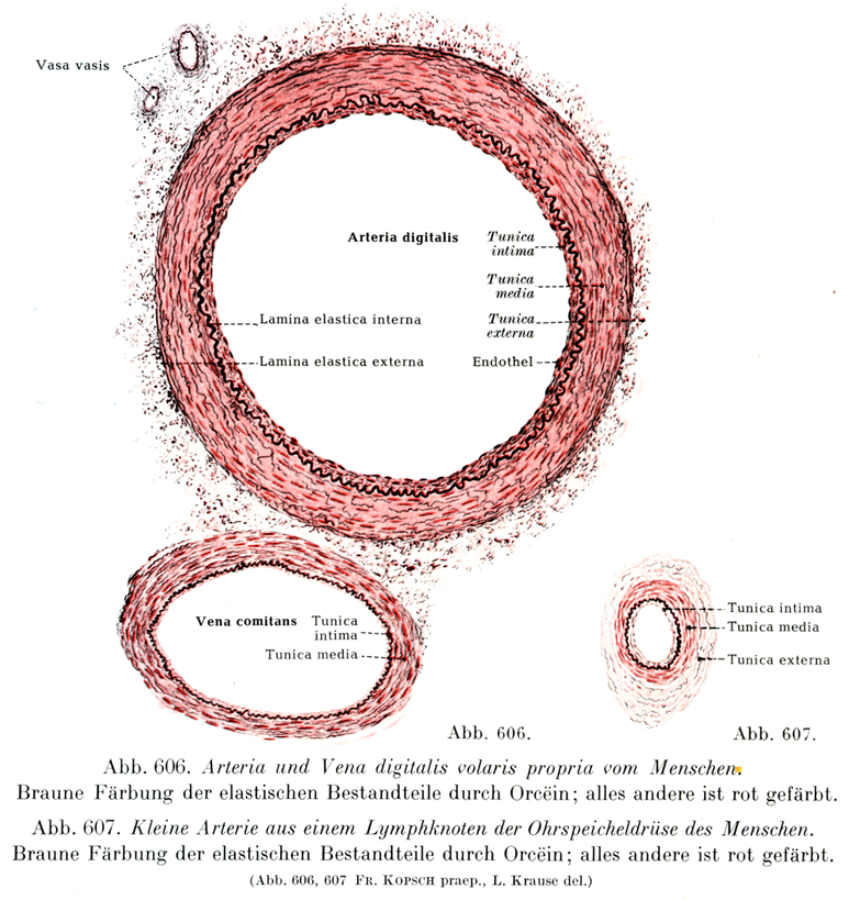 [図607] ヒトの耳下腺リンパ節の小動脈 弾性成分はオルセインにより褐色に染り他のものはすべて赤く染つている.