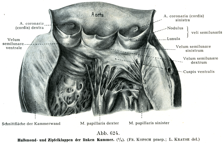 動脈口は円形で,そのそばにある房室口よりもいくぶん狭い.ここには3枚の帆があり1つは前方に,他のものは右と左にあり,それぞれ前半月弁,右半月弁,左半月弁Velum semilunare ventrale, dextrum, sinistrumという.右と左の半月弁は二尖弁の前尖と会合する(図621, 624).この3枚の帆は右側のものに比べて厚くて丈夫であり,半月弁半月や半月弁結節もそれに応じていっそうはっきりしている.大動脈洞もまた強くふくれている.