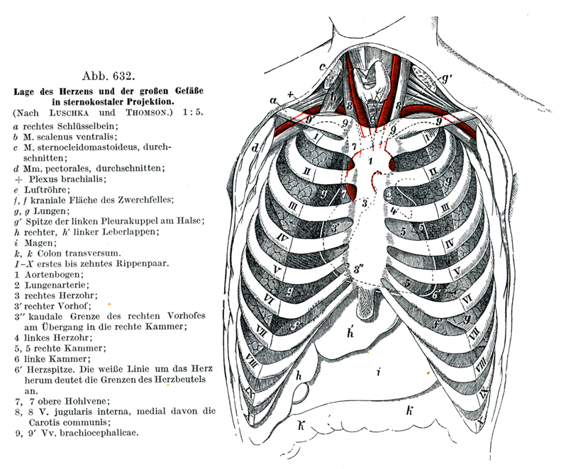 [図632] 心臓と大血管の位置を胸骨と肋骨の面に投影した図 (LuschkaおよびThomsonによる) (1/5) a 右鎖骨;b 前斜角筋;c 胸鎖乳突筋;d 大と小胸筋,切断;および腕神経叢;e 気管;f, f横隔膜の上面;g, g' 肺臓;g'頚部にある左胸膜頂の尖った上端部;h 肝臓の右葉, h'肝臓の左葉;i 胃;k, k横行結腸, I~X 左右それぞれ対をなす第1ないし第10肋骨;1大動脈弓;2 肺動脈;3 右心耳;3'右心房;3"右心房の下界で右心室への移行部;4 左心耳;5, 5右心室;6 左心室;6'心尖. 心臓の周囲をとりまく白線は心膜の境を示す;7, 7 上大静脈;8,8'内頚静脈,その内側に総頚動脈がある;9,9'腕頭静脈.