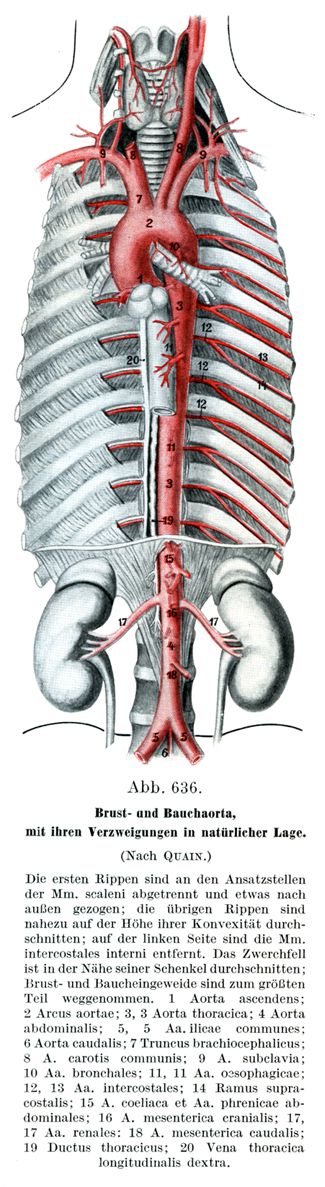 [図636] 自然の位置にある胸大動脈と腹大動脈およびそれらの枝(Quainによる) 第1肋骨は斜角筋の停止するところで分離し,やや外方に引いてある.その他の肋骨はだいたいに最も外側に突出したところで切断し,左側では内肋間筋を除去してある. 横隔膜はその脚の近くで切断, 胸部と腹部の内臓は大部分とり出してある.1上行大動脈;2大動脈弓;3, 3 胸大動脈;4腹大動脈;5, 5 総腸骨動脈;6尾動脈;7腕頭動脈;8総頚動脈;9鎖骨下動脈;10気管支動脈;11,11食道動脈;12,13肋間動脈;14肋骨上枝;15腹腔動脈と下横隔動脈;16上腸間膜動脈;17,17腎動脈;18下腸間膜動脈;19胸管;20右縦胸静脈.