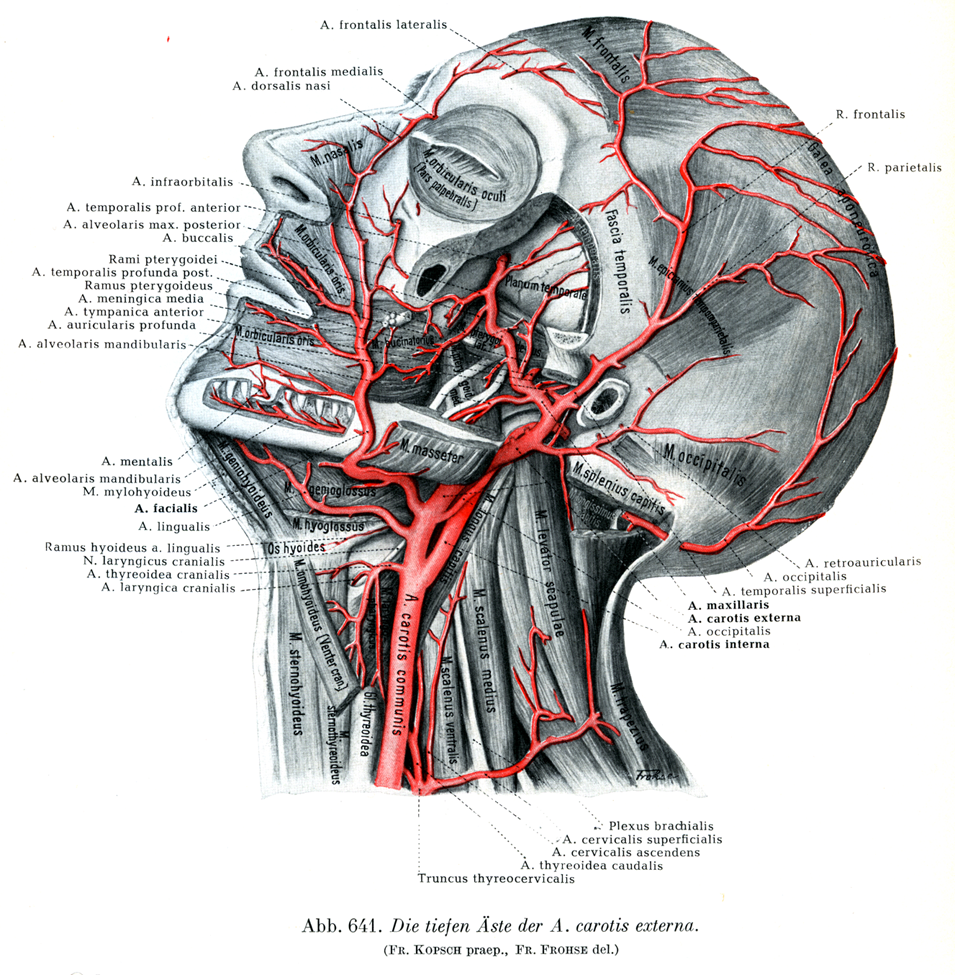 g)頭頂枝R. parietalis(図639~641).後方に向う終枝であって,前者よりも太いことが普通である.側頭筋膜の上で耳介の上方を越えて後方にすすみ,頭蓋骨を外から被っているものに枝をあたえる.頭頂部では他側の同名動脈と吻合し,また前方と後方では近在の動脈枝とつながっている.