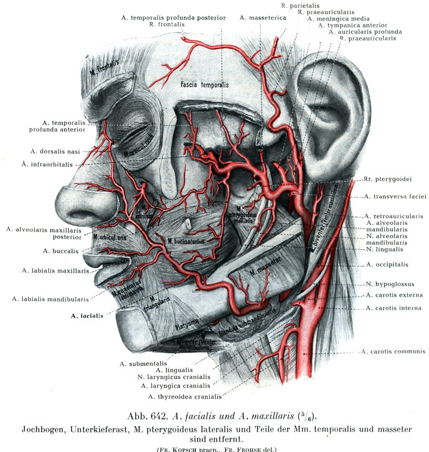 顎動脈はいっそう太い終枝として外頚動脈から直角をなして出る.その起始部は顎関節の下方にあって,耳下腺により被われている.この動脈はうねっていて下顎頚と蝶顎靱帯の間を水平に前方にすすみ,外側翼突筋と側頭筋のあいだに達する.ついで外側翼突筋の両頭のあいだにいたり,そこを越えて翼口蓋窩にはいり,そこで終枝に分れる.このことから顎動脈を下顎部Pars mandibularis,翼突部Pars pterygoidea,翼口蓋部Pars pterygopalatinaに分けることができる.