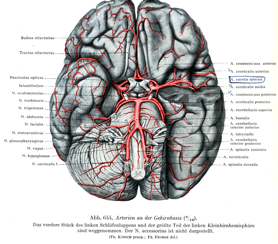 これは内頚動脈のいっそう太い方の終枝で外側に向かっている.外側大脳裂あ初まりのところで起り,この裂溝のなかを後上方にすすみ,その付近の大脳半球を養っている.