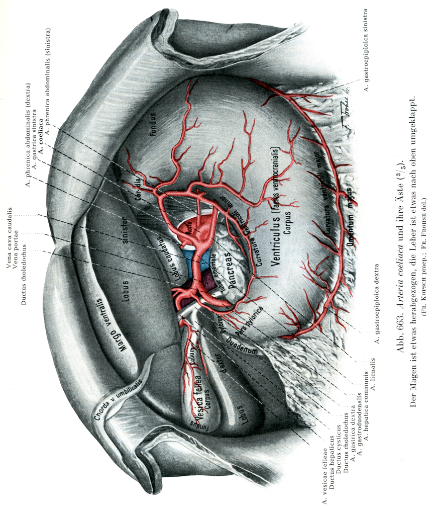 ) 胃を少し下に引ぎ下げ,肝臓を少し上に折り返してある.