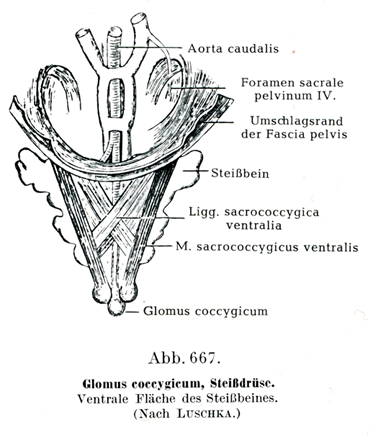 [図667] 尾骨動脈糸球Glomus coccygicum 尾椎の前面(Luschkaによる)