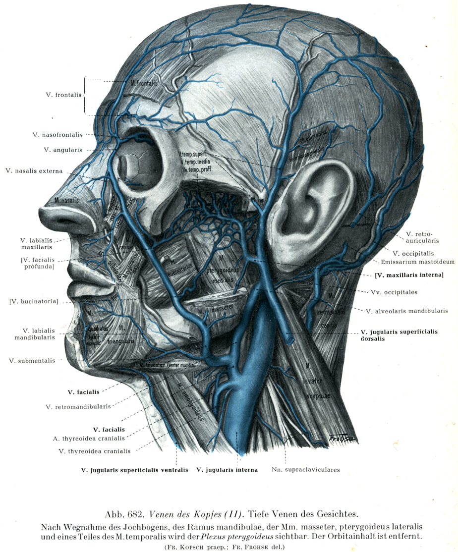 [図682] 頭部の静脈(II) 顔面深層の静脈. 頬骨弓,下顎枝,咬筋,外側翼突筋を取り除き,また側頭筋の一部を取り除いて翼突筋静脈叢が見えるようにしてある.眼窩の内容は除去してある.