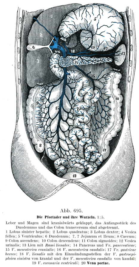 肝臓と胃は上方に折り返し十二指腸の初めの部分と横行結腸は切り取ってある.1肝臓の左葉;2方形葉;3右葉;4胆嚢;5胃;6十二指腸;7空腸と回腸;8盲腸;9上行結腸;10下行結腸;11S 状結腸;12膀胱;13脾臓と脾臓枝;14膵臓と膵臓静脈;15上腸間膜静脈;16下腸間膜静脈;17短胃静脈;18脾静脈 左胃大網静脈が上方から,下腸間膜静脈が下方から開口しているところ;19胃冠状静脈;20門脈.