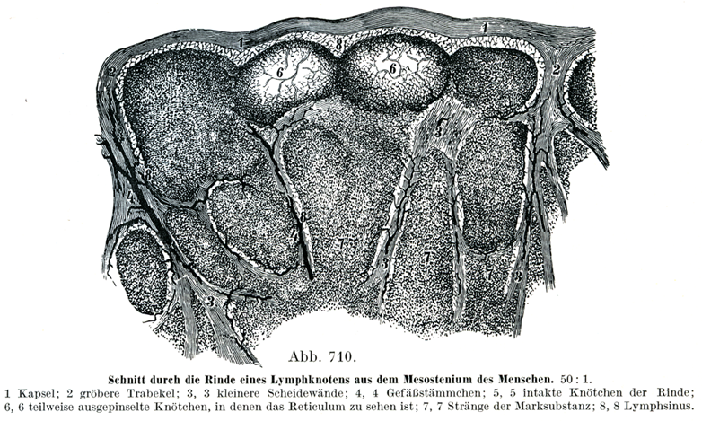 上に述べた小槽と網目のなかには実質組織,すなわちリンパ様質が一定の様式をもって収められている.小槽には皮質小節Rindenknötchen(図710, 5, 6)があり,これは小槽より小さく,またこの皮質小節と小槽壁のあいだに皿形をしたせまい隙間が残されている(図710,8).皮質小節はその内面からリンパ様組織の突起,すなわち髄索Fasciculi medullares, Marksträngeを送りだして,これがたがいに合して網を成している(図708).この網は髄質の網材のなかにあり,髄質の最も大切な部分である.このことは皮質小節が皮質の本質的な部分であるのと同じである.言いかえるとリンパ様組織は皮質では皮質小節の形をとり,髄質では髄索の形をなしていて,この髄索は皮質小節からつづいて出てたがいに網を作っているのである.皮質小節および被膜と梁柱のあいだにはぐるりと取りまいて狭い隙間が存在し,そこをリンパの流れが通っている.それと同じように髄索の網と髄質の梁柱系との間にもあらゆる側にリンパが流れるための狭い隙間が開いていて,これがいたるところで皮質の同じような隙間とつながり,そして全体としてリンパ節のリンパ路ができている(図708).このリンパ路には一方では輸入管が注ぎ,他方では輸出管が開いている.また血管が髄索と皮質小節のなかで分枝している.皮質小節を外方および側方から皿状にとりまいている隙間を特にリンパ隙Lymphspalteまたリンパ洞Lymphsinusと呼ぶ.しかしリンパ路の全体がまったく何もその中にない自由な通路ではなくて,いたるところで細い網状物がその内部を貫いており,この細網は一方では皮質小節と髄索の密なリンパ様組織に進入して,その網材に続き,また他方では被膜と梁柱系の全部に固く着いている.
