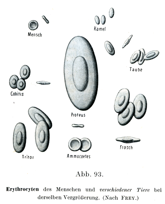 [図93]ヒトおよび諸種の動物の赤血球を同じ拡大で示す.(Freyによる.) Mensch・・・ヒト,Kamel・・・ラクダ,Cobitis・・・シマドジョウ(硬骨魚類),Taube・・・ハト,Triton・・・イモリ(有尾両棲類),Proteus・・・ヨーロッパの洞窩に住む盲目の有尾両棲類,Frosch・・・カエル,Ammocoetes・・・スナヤツメ(円口類)の子供.
