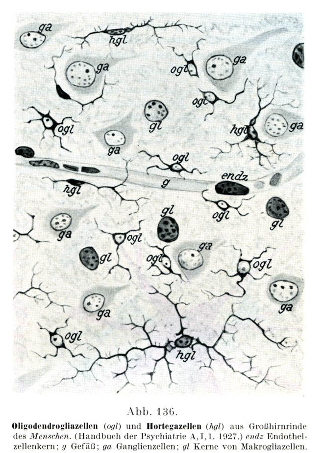 [図136]稀突起膠細胞(ogl)とオルテガ細胞(hgl).ヒトの大脳皮質より.(Handbuch der Psychiatrie. A. I,1.1927. )endz内皮細胞の核;g血管;ga神経細胞;gl大膠細胞の核.