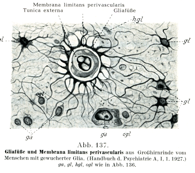 [図137]膠小足と血管周囲境界膜 ヒトの大脳皮質でグリアが増殖しているもの.(Handbuch d. Psychiatrie. A. I,1.1927. )ga, gl, hgl, oglは図136のと同じ.