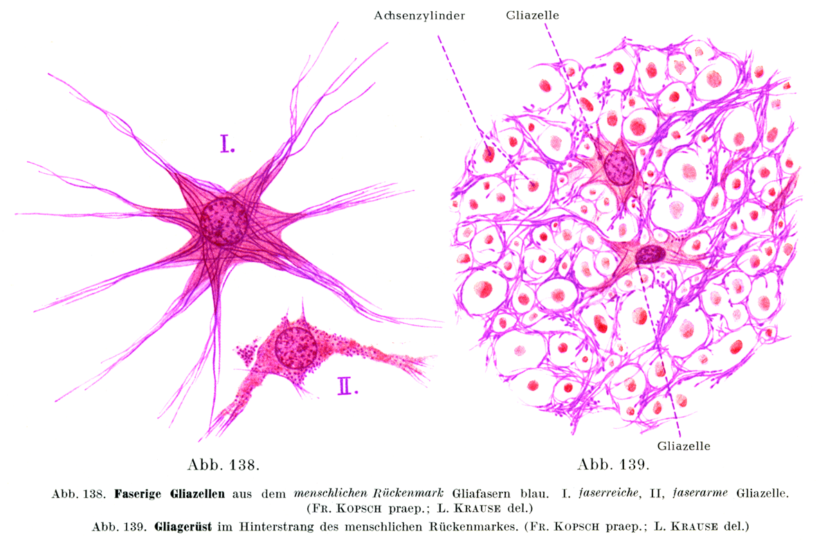 ヒトの脊髄より.グリア線維は紫.I. 線維の多いグリア細胞,II. 線維の少ないグリア細胞.