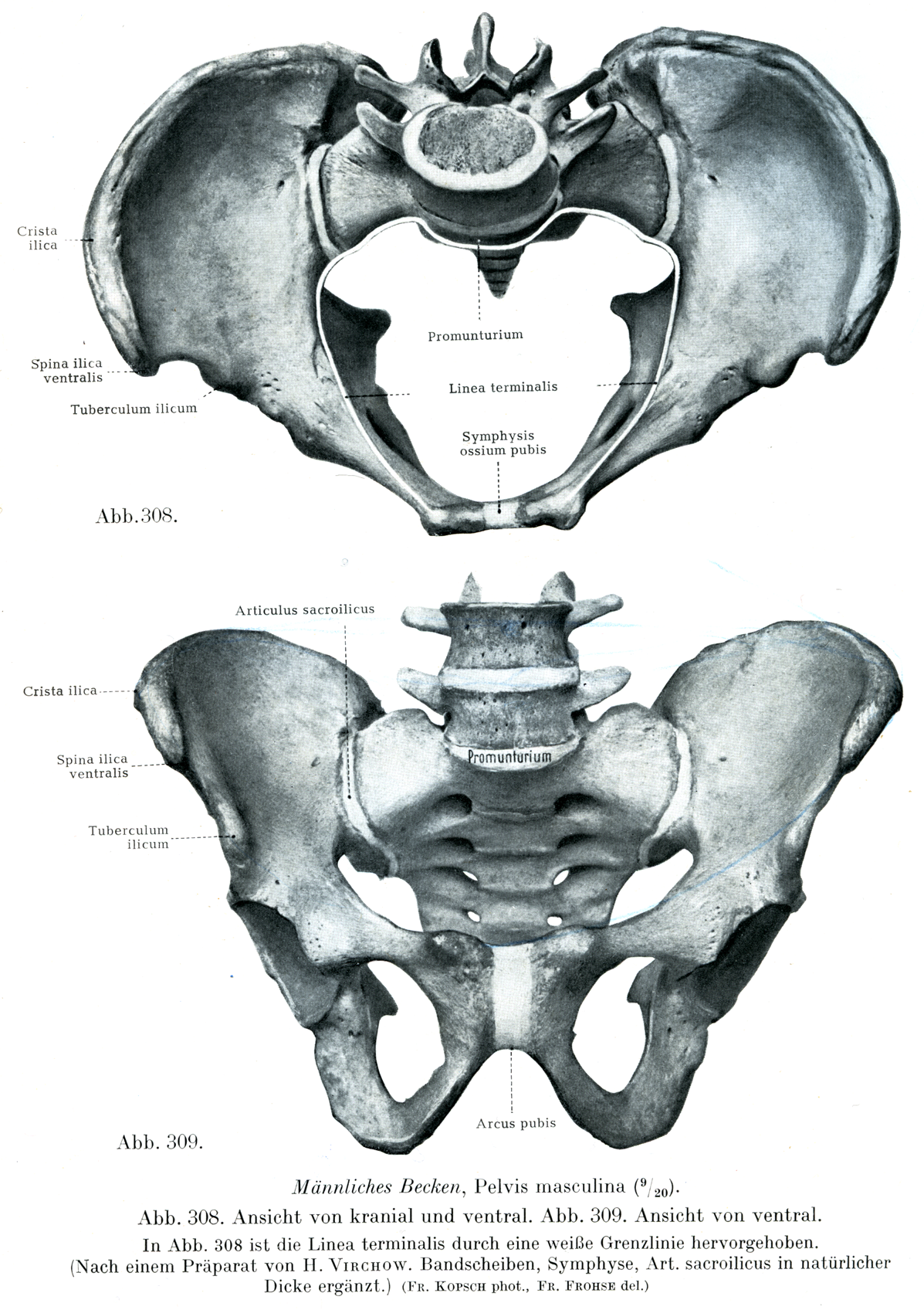 [図308, 309]男の骨盤(9/20),図308は前上方から,図309は前方からみる.図308では分界線Linea terminalisが白い境界線であらわしてある. (H. Virchowの標本による.椎間円板・恥骨結合・仙腸関節は自然の厚さを保っておぎなわれている.)