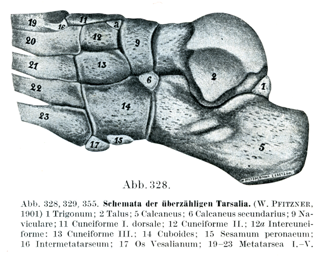 [図328, 329, 355]過剰足根骨の模型図 (W. Pfitzner,1901)1三角骨Trigonum, 2距骨,5踵骨,6二次踵骨Calcaneus secundarius,9舟状骨,11背側第一楔状骨Cuneiforme I dorsale,12第二楔状骨,12a楔状間骨Intercuneiforme,13第三楔状骨,14立方骨,15腓側種子骨Sesamum peronaeum,16中足間骨Intermetatarseum,17ヴェサリウス骨Os Vesalianum,19~23第一~第五中足骨.